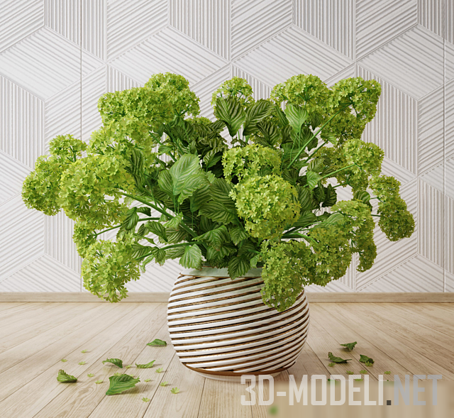 Оригинальная пузатая ваза с диагональными полосками на поверхности идеально дополнена букетом из желтых цветов (могут быть в зеленом варианте).