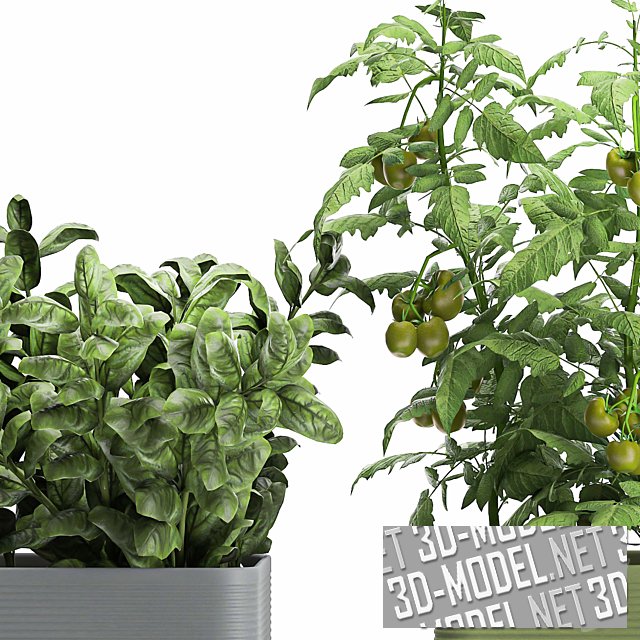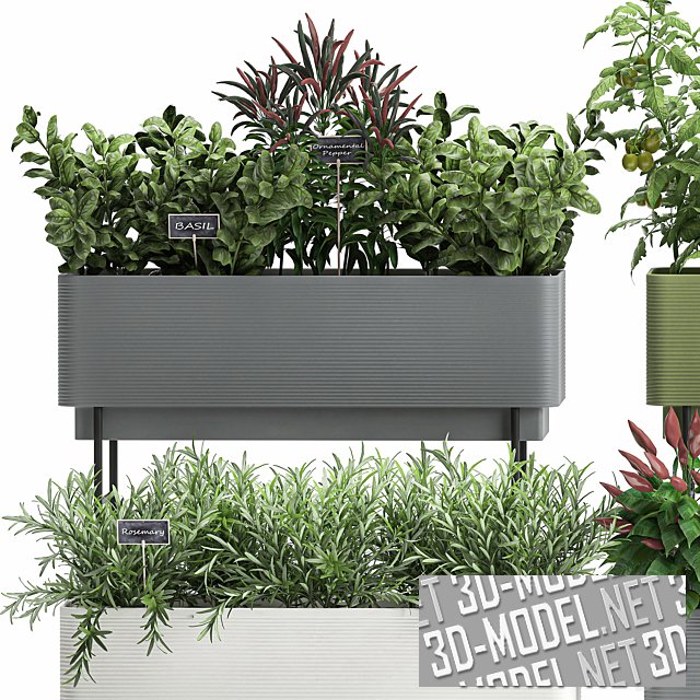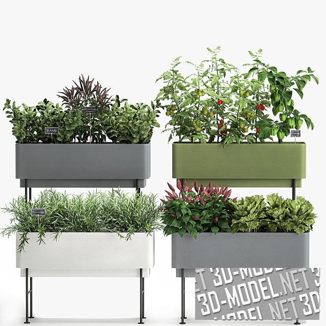 Четыре контейнера на подставках, с огородной зеленью, цветами и овощами от Crescent Garden. Пластиковые поверхности со скругленными углами и легким горизонтальным рельефом представлены в трех цветах: сером, оливковом и белом. Ножки из металлической трубы небольшого сечения - черные. В контейнерах: кусты перца, томата, заросли розмарина, базилика, салата.