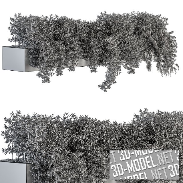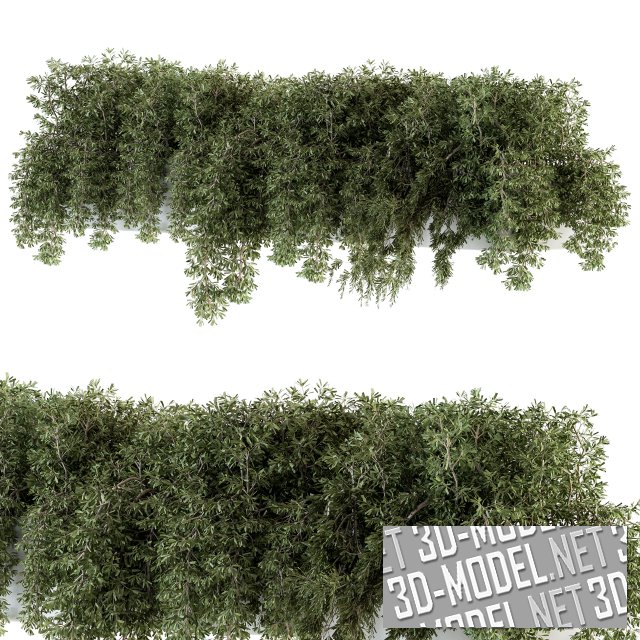 Длинный прямоугольный контейнер белого цвета с густыми зарослями вьющегося растения. Растение с одеревеневшими ствоЛами и ветками и небольшими продолговатыми зелеными листьями создают красивое густое «облако» с несколькими свисающими ветками.