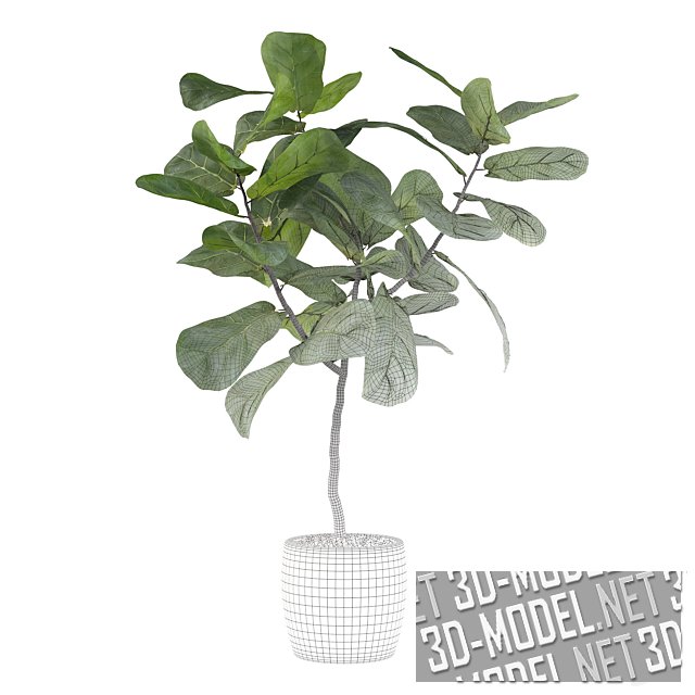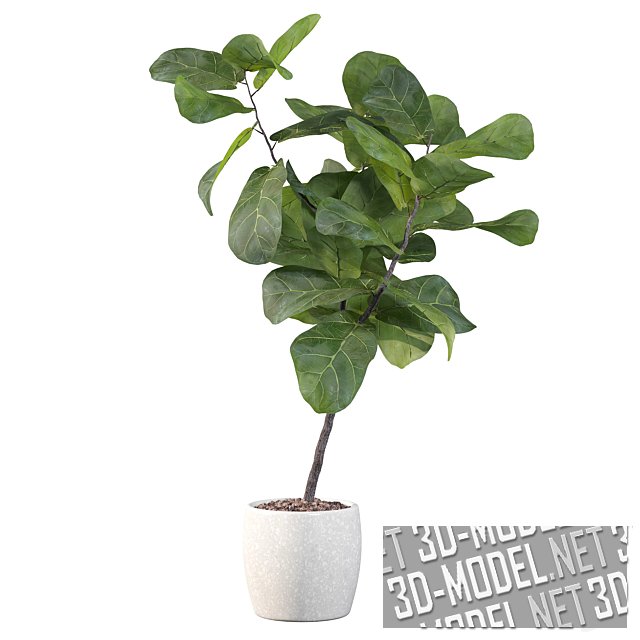 Деревце фикуса лировидного, с характерными крупными листьями зеленого цвета. Растение высажено в круглый светло-серый горшок с белыми вкраплениями.