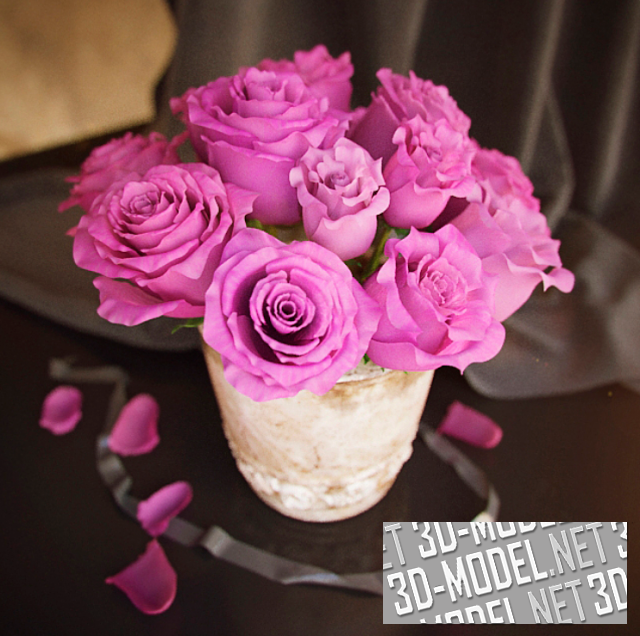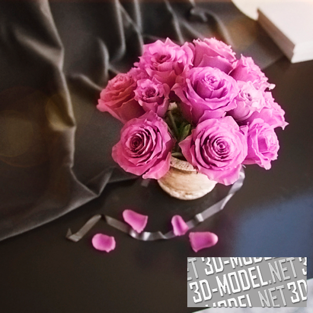 Керамическая ваза в классическом стиле, с барочным барельефным орнаментом в нижней части. В вазе - букет коротких роз. На столе, возле вазы - серебристая ленточка и опавшие лепестки.