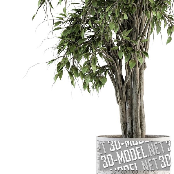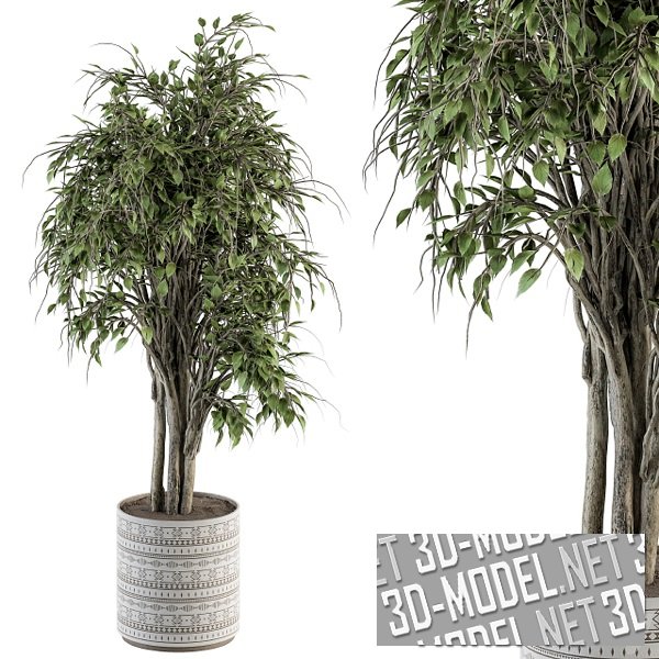 Красивое и очень популярное комнатное растений фикус (Ficus Benjamin), которое отлично смотрится в самых разных помещениях. Фикус посажен в горшок светлого цвета, с орнаментом.