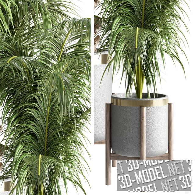 Старая пальма с коротким и толстым древесным стволом, молодая пальма и крупная аспидистра в трех серых цилиндрических горшках на деревянных подставках. Горшки - разного размера, декорированы по верхней части золотистыми металлическими ободками.