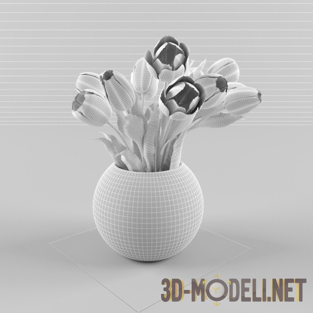 3D модель букета разноцветных тюльпанов в круглой стеклянной вазе. Отличная модель для создания хорошего настроения в любом интерьере. Сцена содержит: