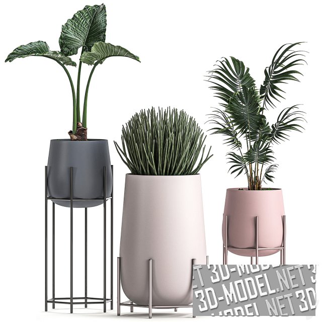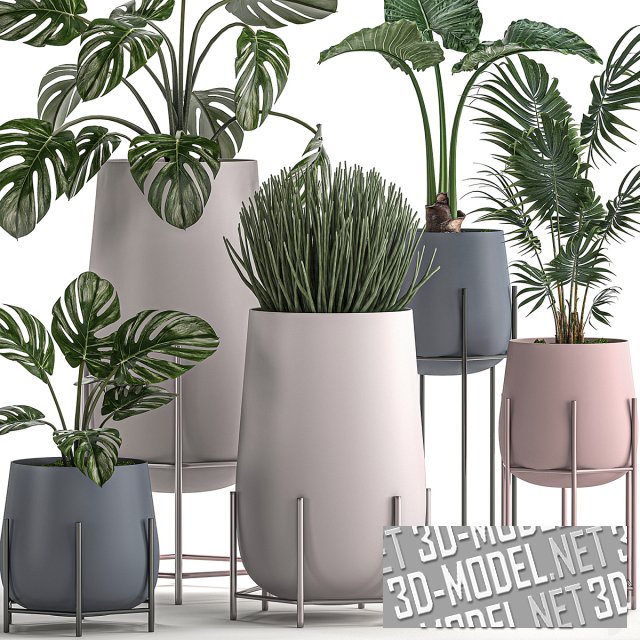 Пять разновеликих цветочных горшков в матовых пастельных тонах (серо-синий, бледно-бежевый, бледно-розовый). Дно горшков - в форме полусферы, поэтому они размещены на подставках из металлических трубок. В горшках: сенсевьера цилиндрическая (Sansevieria cylindrica), монстера, кентия, алоказия.