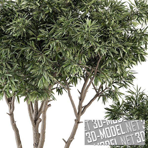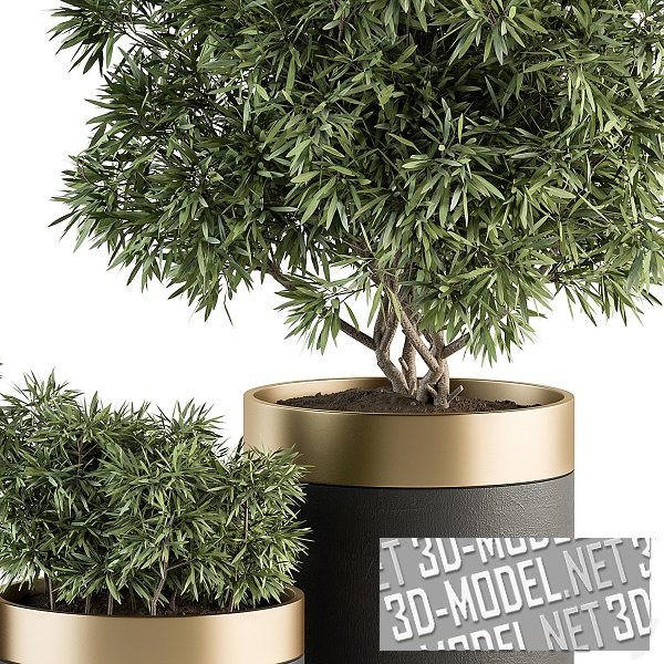Дерево и кусты олеандра без цветов, с характерными удлиненными листиками, в трех крупных горшках. Горшки скомбинированы из черных матовых цилиндров и золотистых ободов.