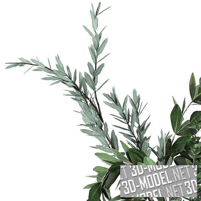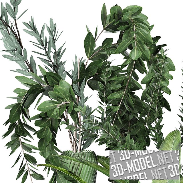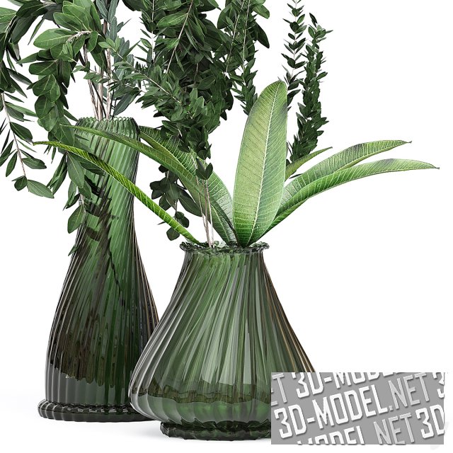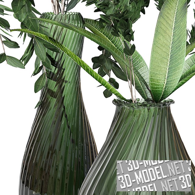 Букеты из веток оливы, бирючины, самшита и плюмерии в двух вазах. Граненые вазы выполнены из темно-зеленого стекла, разной формы и размера.
