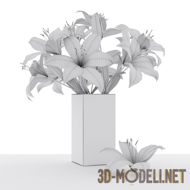 3d-модель белых лилий в стеклянной вазе. Идеальное сочетание для декорирования любого интерьера - нежные белоснежные цветы лилий, поставленные с стеклянную прозрачную вазу простой формы. Стебли находятся в воде, с преломлением, что смотрится очень красиво. В архиве находятся форматы max, obj, а также все текстуры.