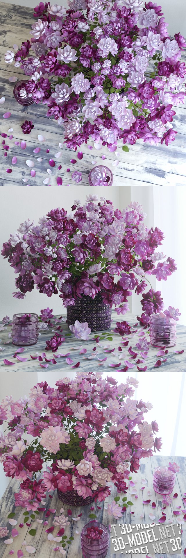 Пышный букет в лиловых тонах и стаканы с лепестками