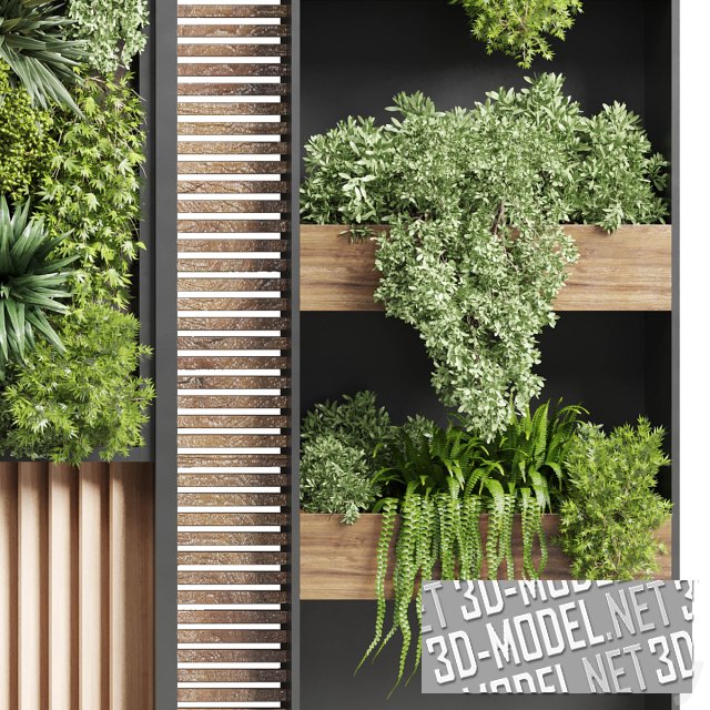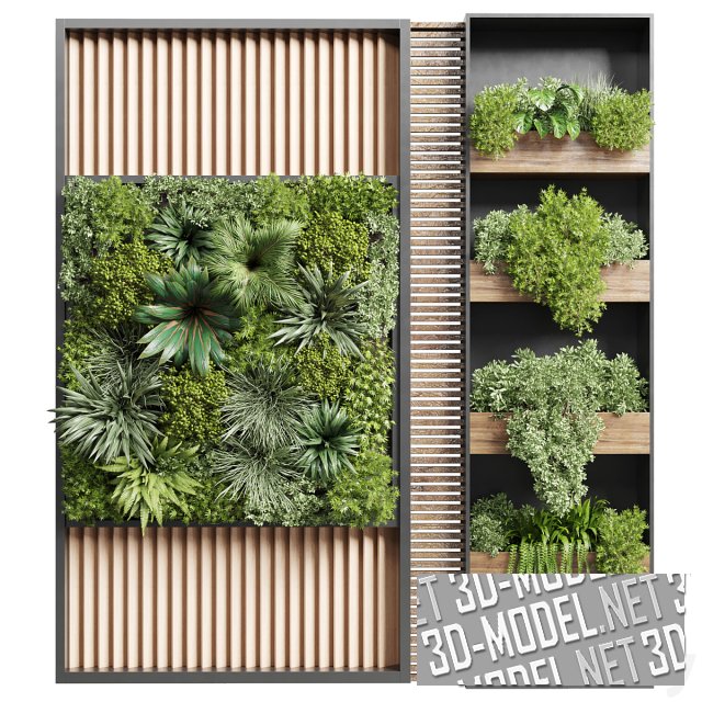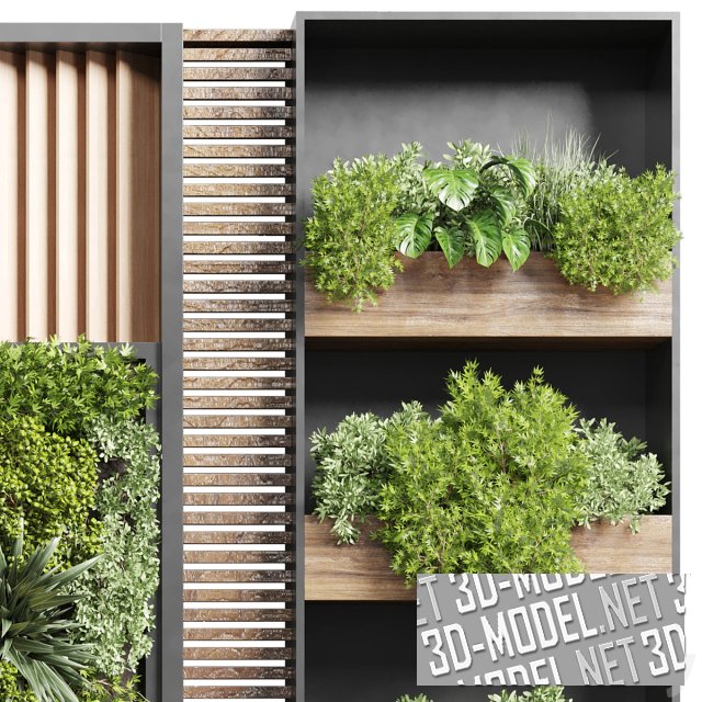 Декоративная пристенная панель с наборкой из деревянных вертикальных реек, с интегрированной фитостеной и открытыми полками в отдельной секции. Основная рама панели и корпус стеллажа - из черно-графитового материала. Вертикальные рейки, вставка с горизонтальными рейками и борта на полках - с текстурой дерева под матовым лаком. Стоящие на полках комнатные растения отлично дополняют фитостену и наполнят интерьер - свежестью натуральной зелени.