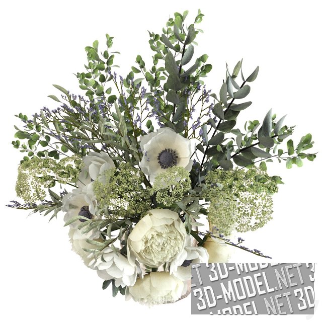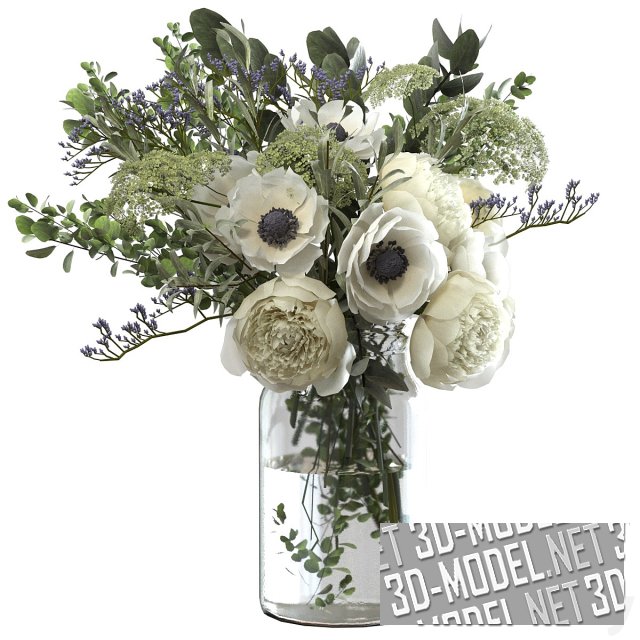 Прекрасный декоративный букет, состоящий из белой анемоны, веток эвкалипта и других растений. Цветы разместились в стеклянной банке.