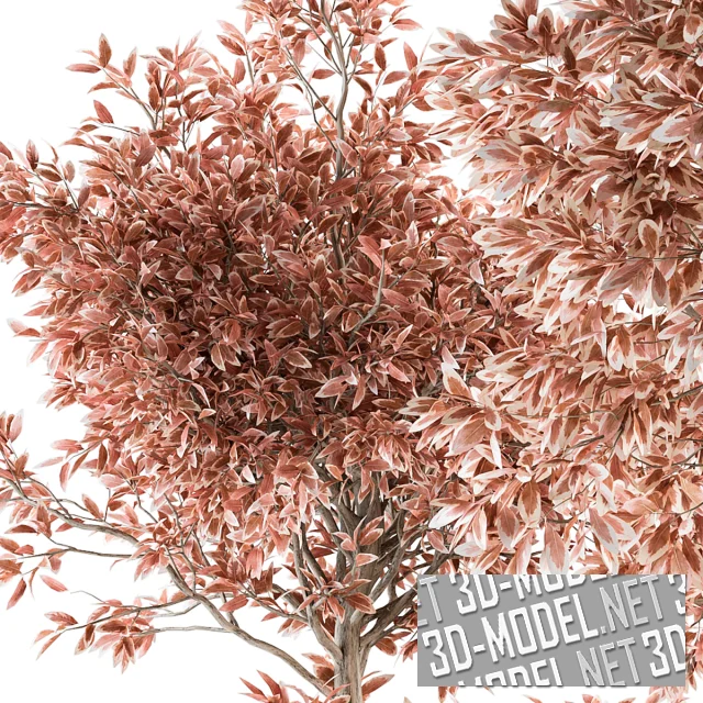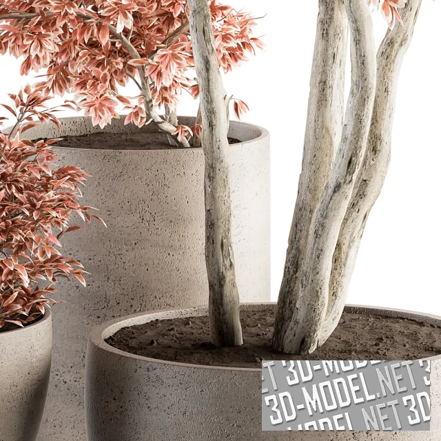 Четыре крупных бетонных горшка разного диаметра и высоты с лиственными растениями с коричневато-розовыми листьями. Листья окаймлены белым, создавая декоративную пышную крону. Растения представлены в виде небольших деревьев (с одним или несколькими стволами) и в виде кустов.