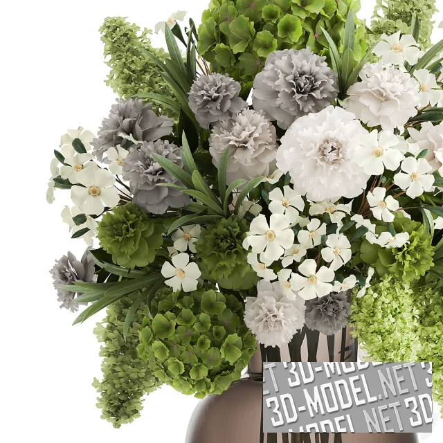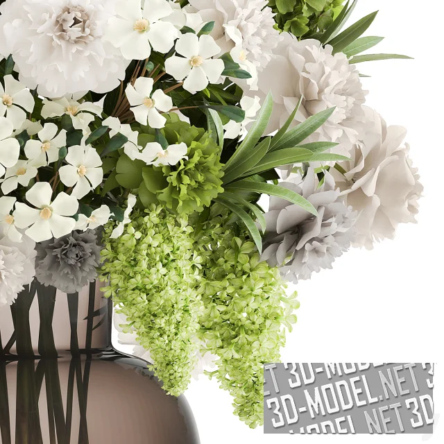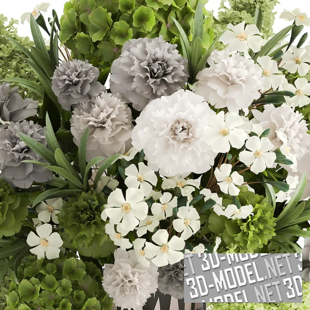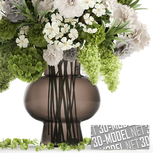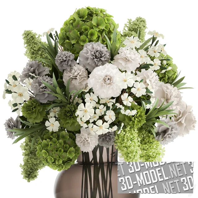 Пышный и красивый букет, собранный из необычных для своего вида оттенков цветов. В композиции собраны кисти сирени и флоксы метельчатые с цветками светло-зеленого цвета, пионы зеленые, белые и в оттенках светло-серого, белые цветы сапонарии и веточки с узкими зелеными листьями. Осыпавшиеся зеленые цветы создают декоративный «коврик» у подножия вазы из тонированного коричневого стекла.