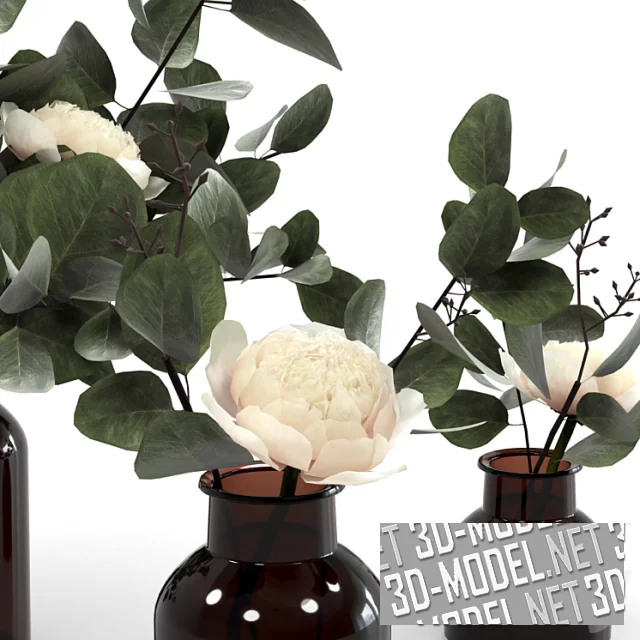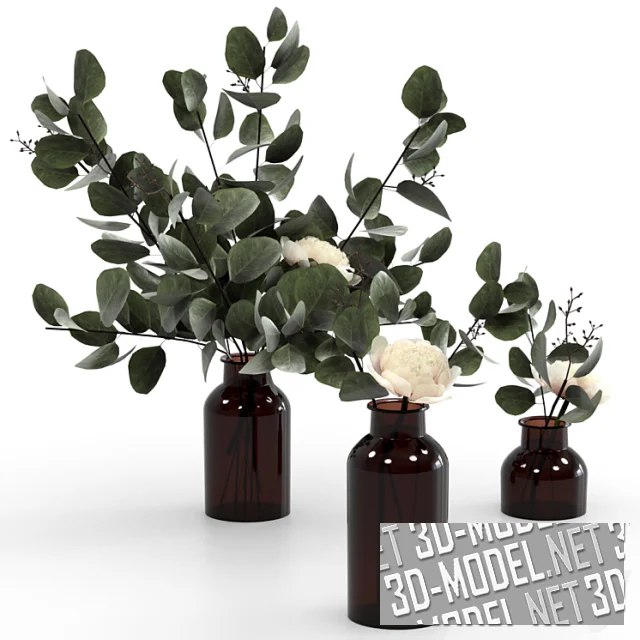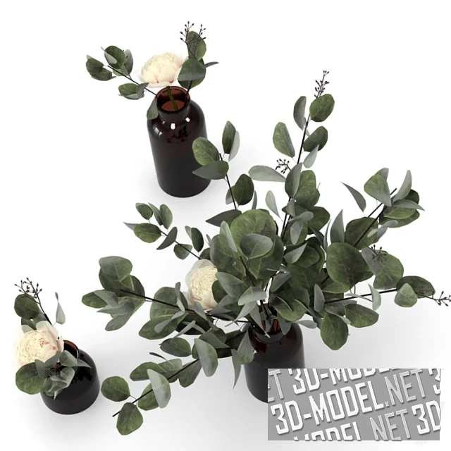 Три черные глянцевые вазы разного размера. В вазах большой раскидистый букет эвкалипта. На фоне его плотных зеленых блестящих листьев красиво смотрится нежная белая роза.