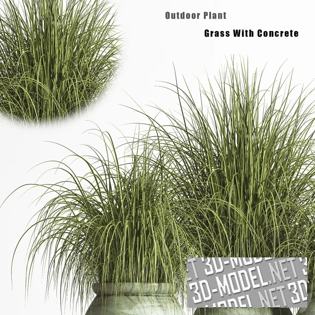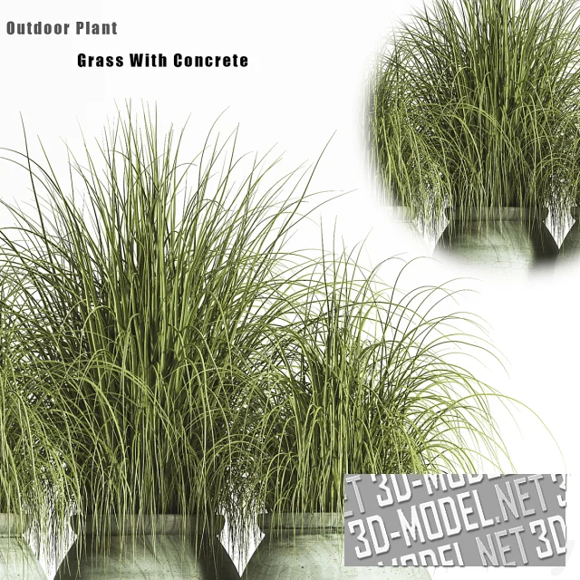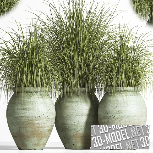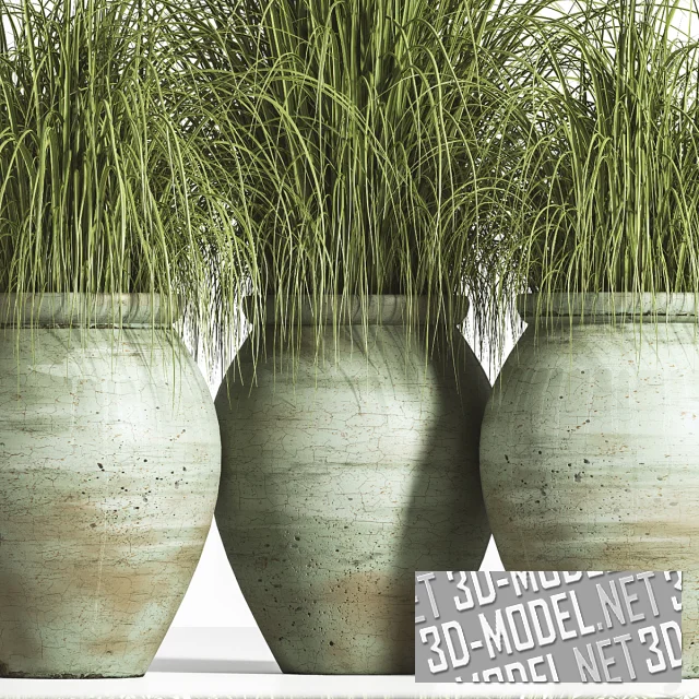 Три крупных бетонных цветочных горшка в виде античных кувшинов с широким горлом для хранения зерна. В горшки высажены пышные пучки зеленой травы с длинными нитевидными ниспадающими листьями. Горшков три, с кустами разного размера.