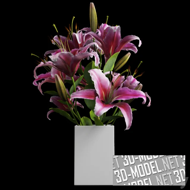Квадратная белая ваза с крупными лилиями. Цветы - с лепестками от насыщенного малинового в центре, к белому на краях. Несколько нераскрытых бутонов и листья добавили в композицию желто-зеленые тона.