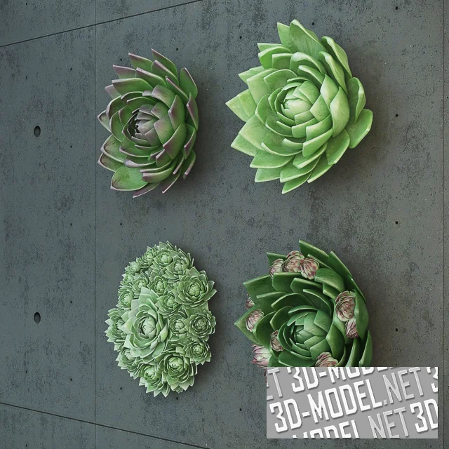 Четыре вида суккулента Каменная роза (Молодило). Сорта: Helveticum (белесый, с крупным растением в центре и множеством маленьких вокруг), Pumilum Armchi (с множеством маленьких сиреневатых «деток» в пазухах взрослого растения), White knight (со светло-зелеными листьями), Purennaicum (с фиолетовыми кончиками на зеленых листьях).