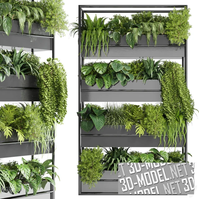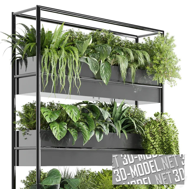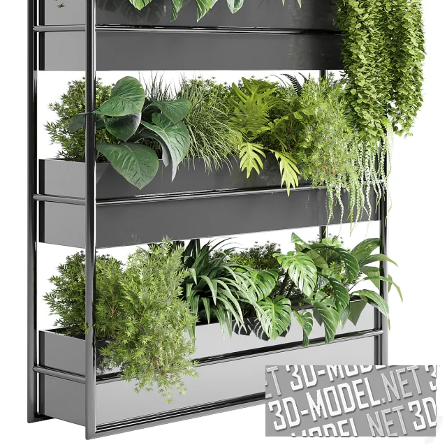 Коллекция комнатных декоративных растений в прямоугольных вазонах, размещенных на прочном металлическом стеллаже. Такая фитостена станет отличным реалистичным наполнением на веранде дома и в других помещениях.