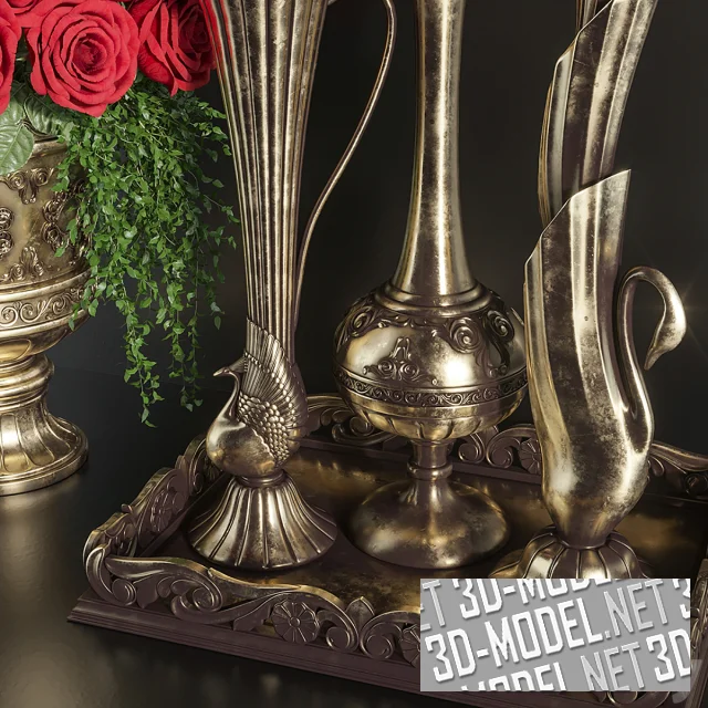 Бронзовые вазы на подносе и крупный цветочный бронзовый вазон в рустикальном стиле. В вазоне большой букет красных роз (23 шт.) с ампельными мелколистными зелеными растениями. Вазы выполнены в виде павлина с высоким хвостом, восточного кувшина с узким высоким горлышком и в виде лебедя с трехкаскадными стилизованными крыльями, составляющими горловину кувшина. Бортики прямоугольного подноса декорированы рельефным литьем с барочными растительными мотивами.