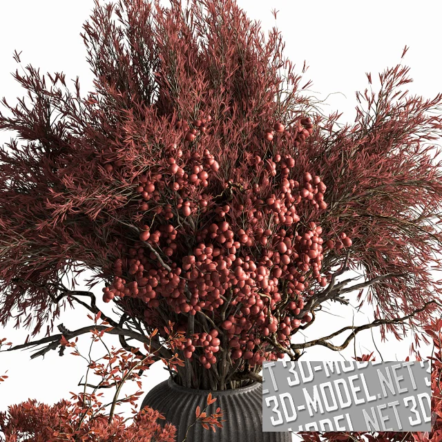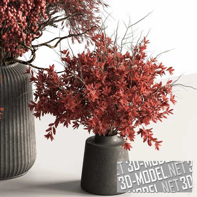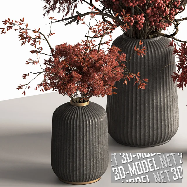 Три керамические вазы серо-коричневого цвета с букетами в красных тонах. Вазы разного размера, с гофрированными и гладкой поверхностью. Средняя ваза дополнена золотистым ободком. В вазах - кривые ветки с мелкими красными листиками. Букет в большой вазе дополняют ветки с красными ягодами.