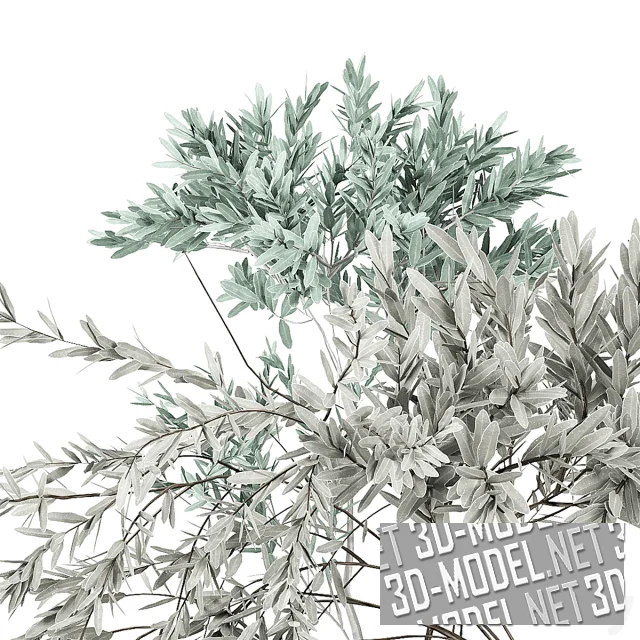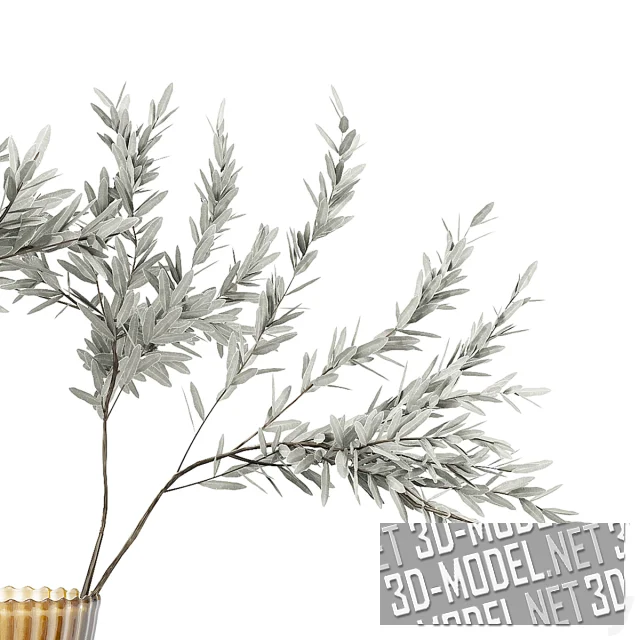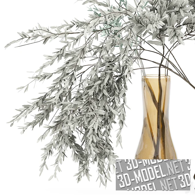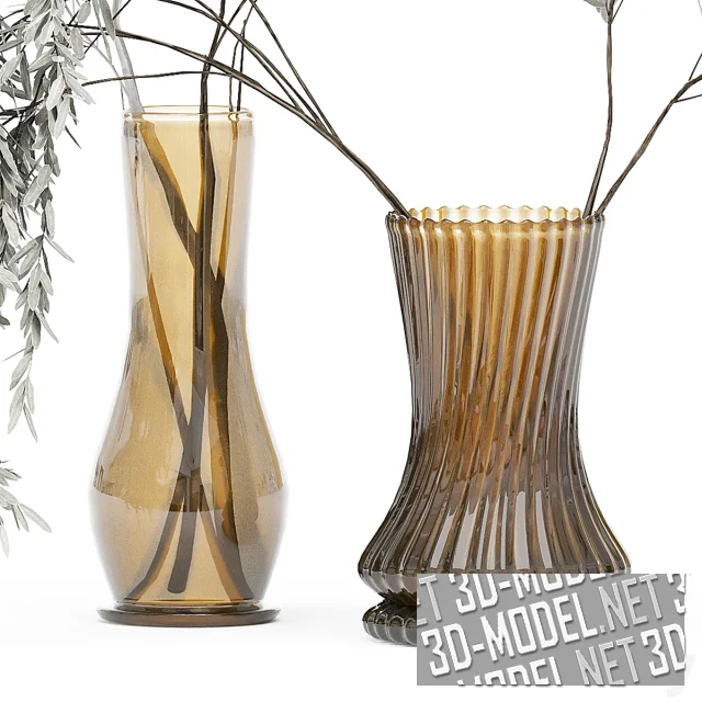 Два букета из веток оливы с серебристо-зелеными и голубовато-зелеными листьями в вазах. Вазы ручной работы, разного размера и формы, изготовлены из тонированного медовым цветом стекла. Одна из ваз гладкая. Вторая декорирована витым продольным рельефным гофрированием.