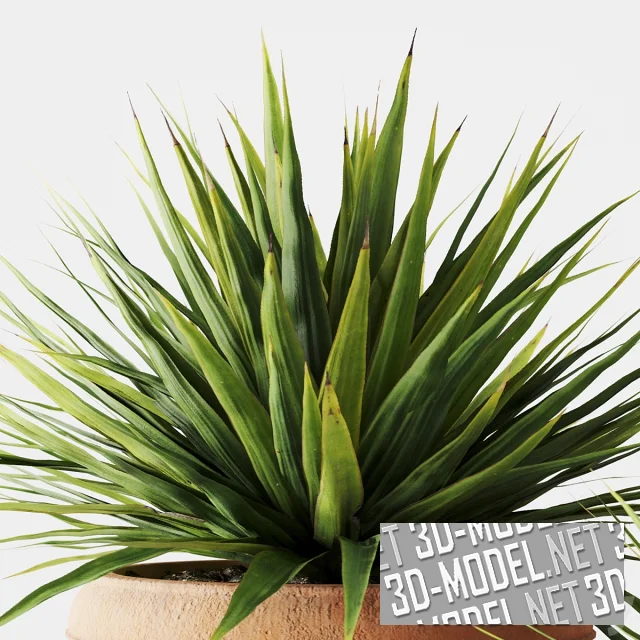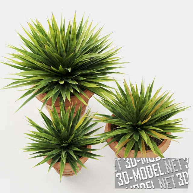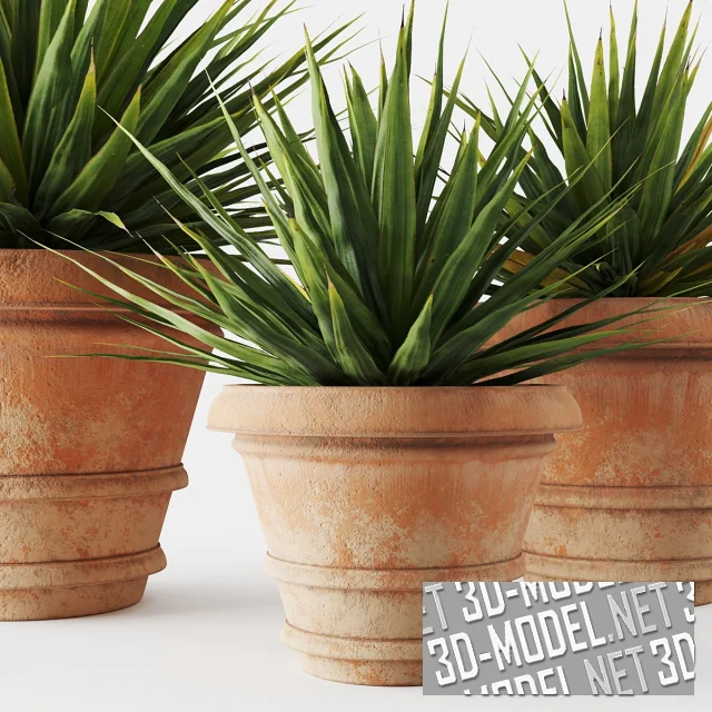 Три рустикальных терракотовых классических цветочных горшка с пышными юкками. В пучке зеленых заостренных листьев просматриваются реалистичные желтые сухие.