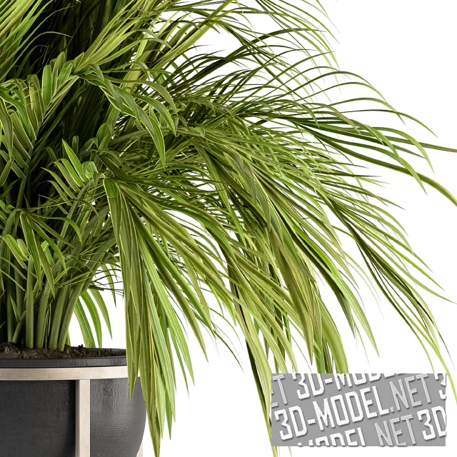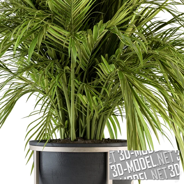 Черный большой цветочный горшок в форме полусферы, на металлической светлой подставке с четырьмя опорами из профильной трубы квадратного сечения. В горшке - пышная невысокая пальма с перистыми листьями (финик, арека, хамедорея).
