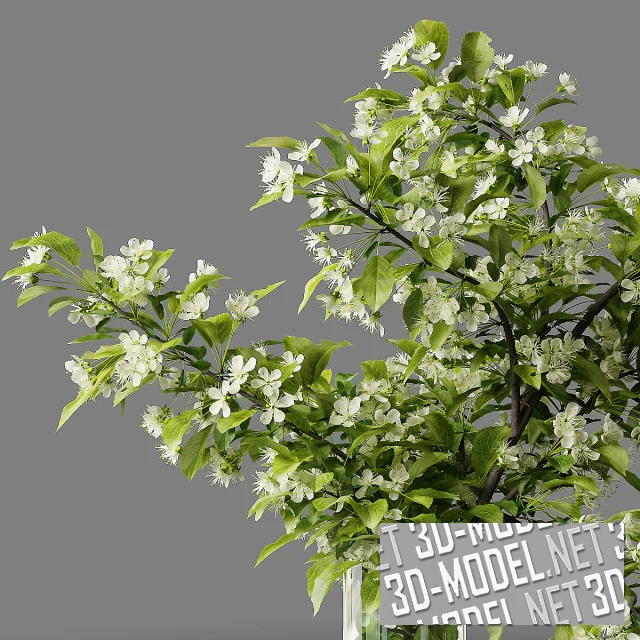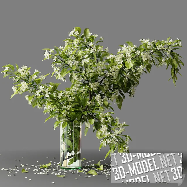 Высокая стеклянная ваза цилинтрической формы с большим букетом веток вишни, с зелеными листьями и мелкими белыми цветами. Нежные белые лепестки насыпаны возле вазы.