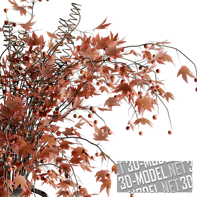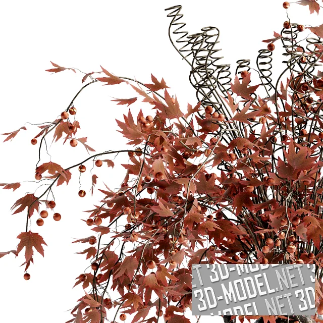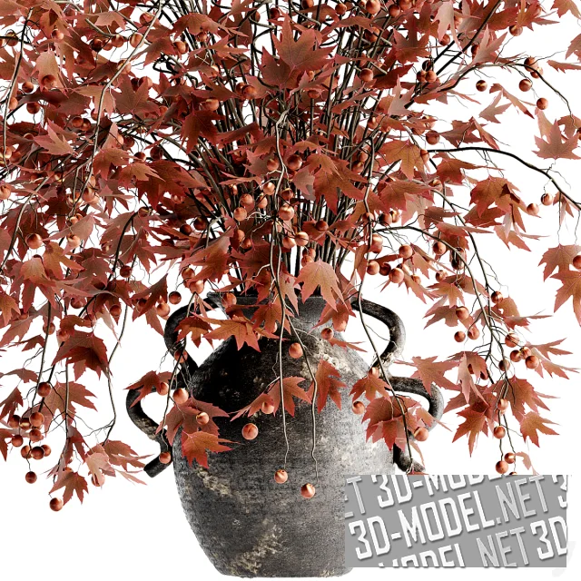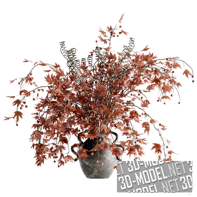 Оригинальный осенний букет. Листья красного клена привносят атмосферу задумчивости в интерьер. Дополняет осеннюю композицию керамическая ваза со спиралевидными ручками по бокам.