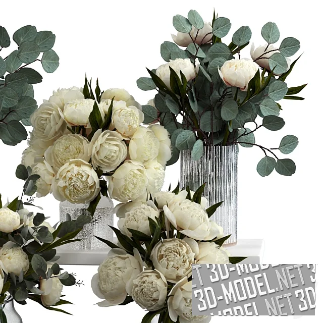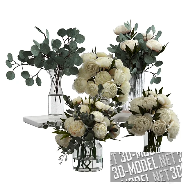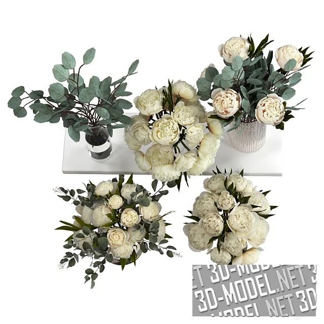 Пять роскошных букетов в разных стеклянных вазах. В цветочных композициях представлены зеленые ветки эвкалипта и пионы белого цвета. Реалистично выполненная 3D модель предлагает украсить интерьер на выбор - только эвкалипт, ветки эвкалипта и немного пионов, пышные букеты пионов или баланс цветов и зелени. Настроенные материалы Vray, Corona и необходимые текстуры находятся в архиве.