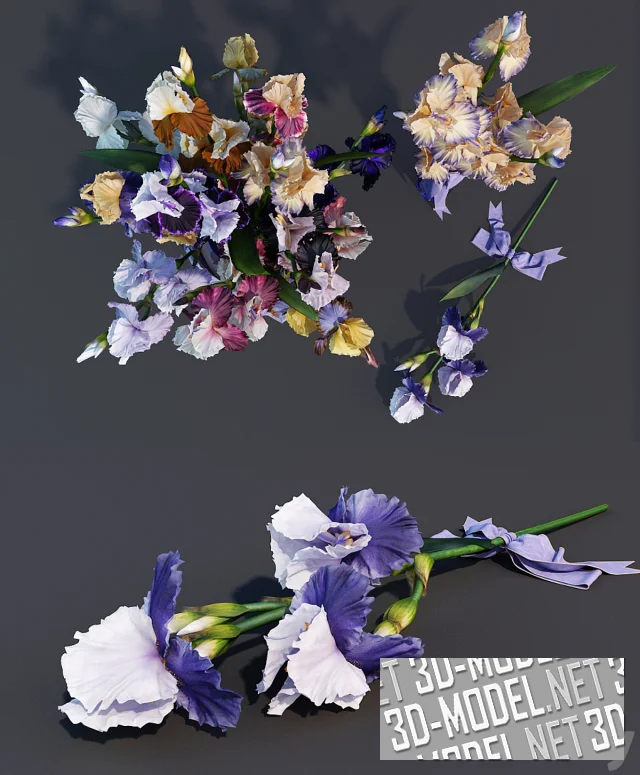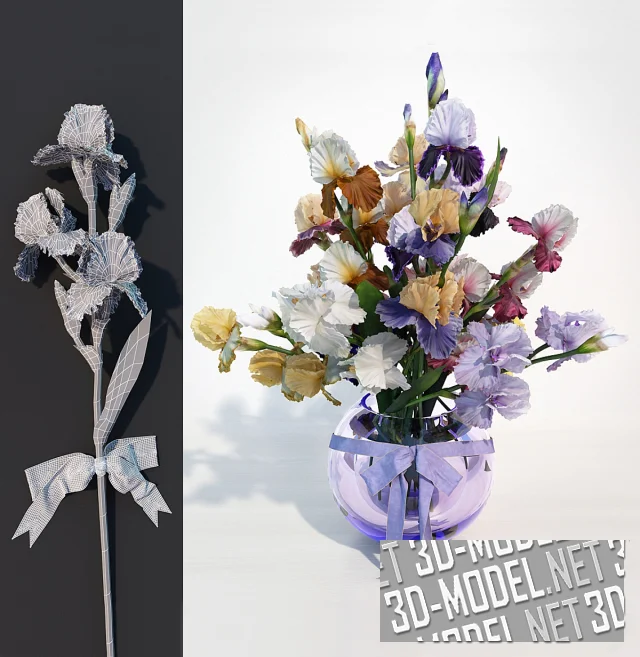 Два привлекательных букета с разноцветными ирисами. Две формы фиолетовой вазы (круглая и цилиндрическая) смотрятся элегантно, гармонично дополняют цветочную композицию. Ирисы украсят любую тумбу, журнальный или консольный стол.