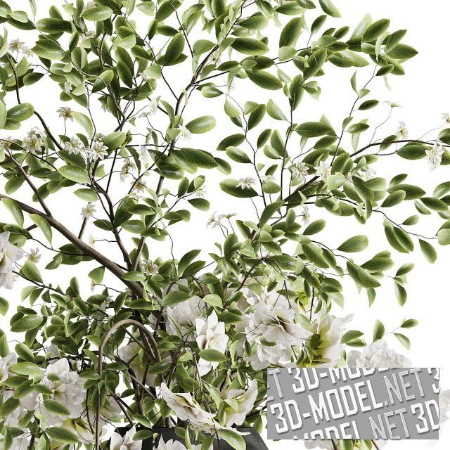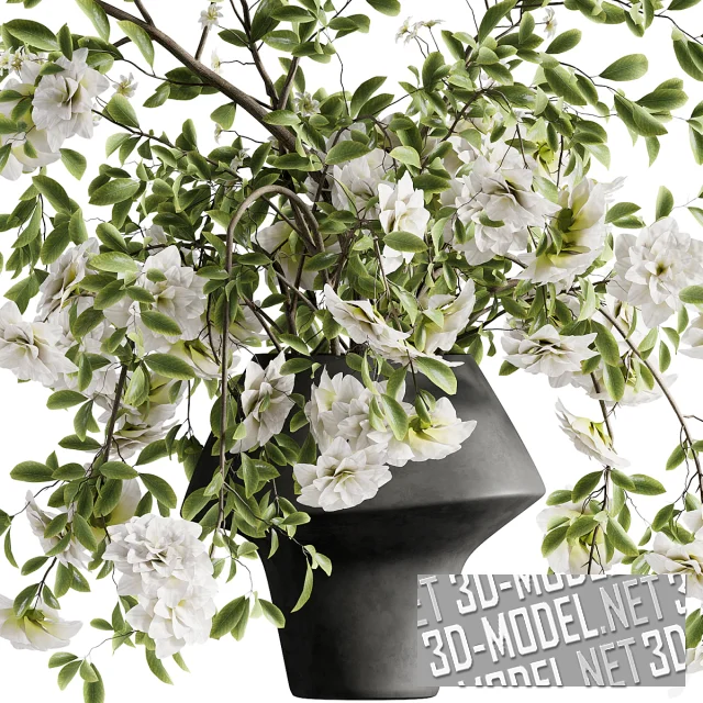 Эта декоративная композиция представляет собой изящные ветви с крупными белыми цветами и густой зеленой листвой, собранные в современную матовую вазу графичной формы. Контраст нежных лепестков и насыщенной зелени создает ощущение свежести и легкости, а сама ваза подчеркивает современный характер аранжировки.