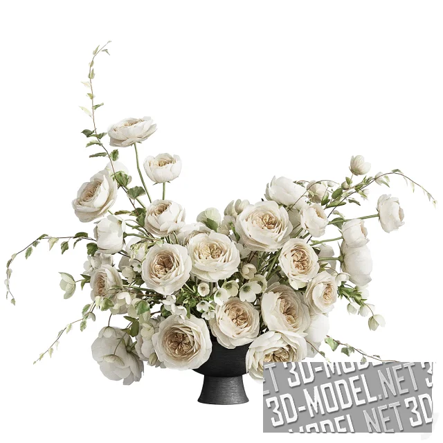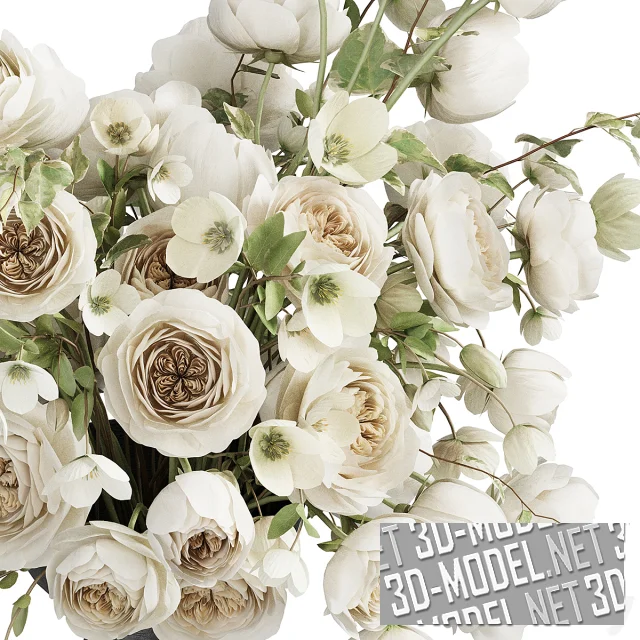 Изысканная цветочная композиция, выполнена в спокойной гамме кремово-белых оттенков. Пышные бутоны роз с плотными лепестками гармонично сочетаются с нежными соцветиями и легкой зеленью, создавая утонченный и аристократичный образ.