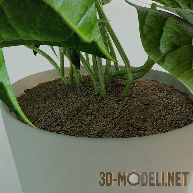 3d модель домашнего растения с крупными зелеными листьями, похожего на спатифиллум. Цветок растет в белом керамическом горшке и может служить прекрасной оживляющей деталью интерьера при визуализации практически любого помещения. Формат: 3D Studio Max 2012. Renderer: VRay 2,0