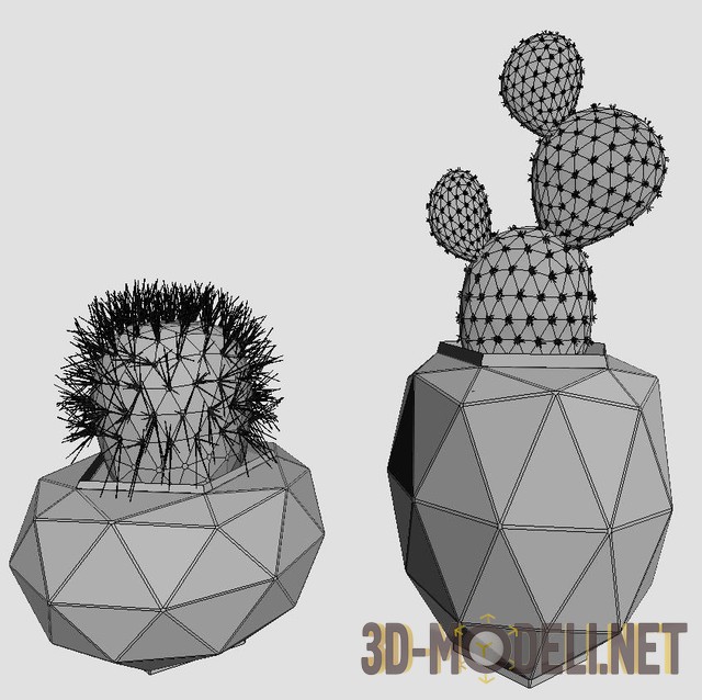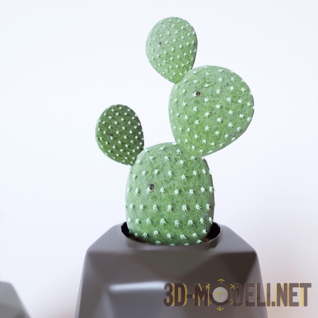 3d модель декоративных кактусов в серых глянцевых горшках многогранной формы. В низком горшочке кактус похож на сорт маммилярию, а в более высоком на опунцию. Станут хорошим дополнением к современному интерьеру.