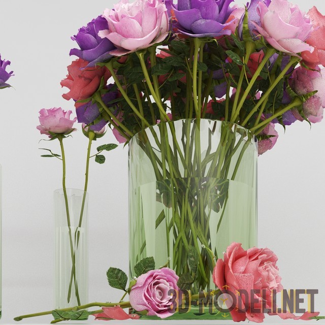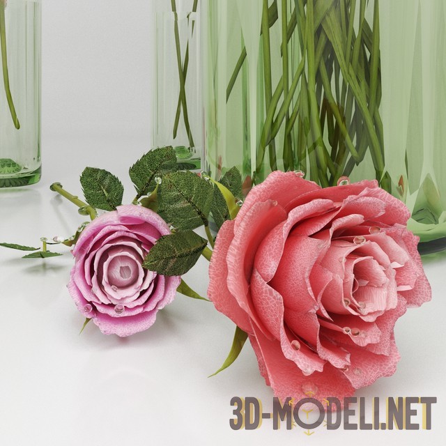 3d-модель прекрасных розово-красных роз, стоящих в различных вазах: одной широкой и трех узких. Возле ваз лежат несколько стеблей с бутонами и осыпавшиеся лепестки. Картинка настолько прекрасная, что эти цветы просто необходимо использовать в интерьере комнаты молодой девушки. В любом другом пространстве розы также будут смотреться великолепно.