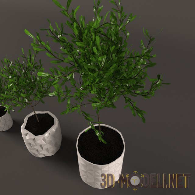 3D модель трех мелколистных фикусов разной высоты, в трех белых горшках с геометрическим выпуклым рисунком.