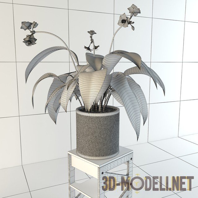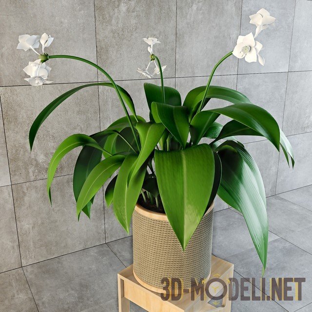 Растение эухарис, или Амазонская лилия – невероятно красивый цветок, на интересной подставке из фанеры. Помещен в декорированный горшок, сделанный из дерева. Горшок обмотан веревкой, что придает ему отличный вид, но внутри находится еще один, пластиковый, под грунт. Эухарис станет свежим и ярким украшением любого интерьера.