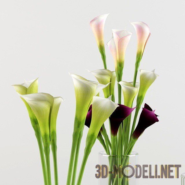 Элегантные и строгие каллы, собранные небольшими букетами в стеклянных вазах. Вазы двух видов, круглая и цилиндрические. Прозрачное стекло и простота дизайна ваз отлично подчеркивает красоту самих цветов.