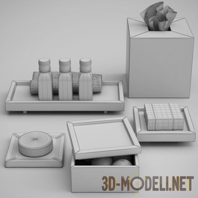 Набор различных аксессуаров для наполнения ванной комнаты, от roomthreesixty, серия Bangkok. Материалами изготовления послужили древесина и керамогранит. Мыло, полотенце, салфетки и косметические средства отлично смотрятся в наборе и придают ему дополнительную достоверность.