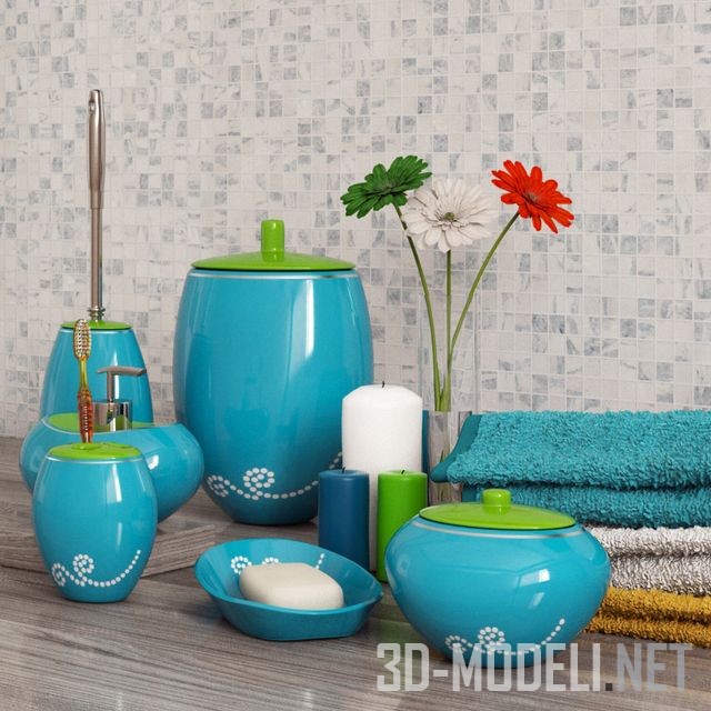 Красивый ярко-голубой комплект с зелеными крышечками ванных принадлежностей Primanova Maison. Тут и две больших емкости, и мыло в мыльнице-лодочке, и жидкое мыло в очаровательном флакончике, и ершик, и стаканчик для зубных щеток, а также стопка махровых полотенец. Очень украшает и дополняет инсталляцию букет герберы в скромной вазе и три свечки - синяя, зеленая и белая.
