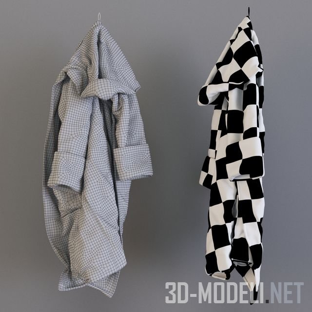 Большой белый махровый халат с широкими рукавами и капюшоном. Очень характерная деталь, которую можно с успехом использовать в интерьере ванной комнаты.