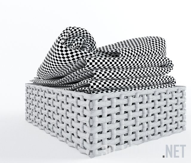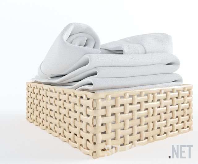 Низкая светло-желтая картина из ротанга, с несколькими мягкими пушистыми банными полотенцами белого цвета. 3D-модель с текстурами.