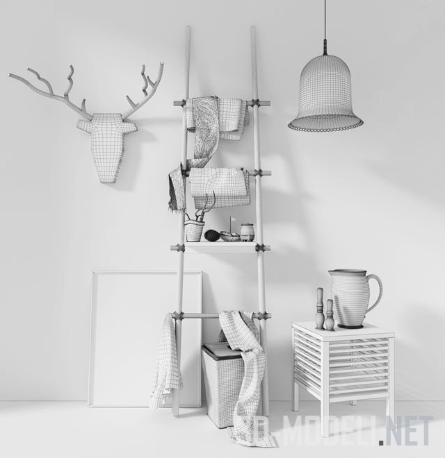 Качественно выполненная, детальная 3D модель набора аксессуаров для наполнения ванной комнаты. В основе композиции лестница-вешалка, дополненная полотенцами и элементами декора. Присутствует корзина, кувшин, настенный декор голова оленя, подвесной светильник.