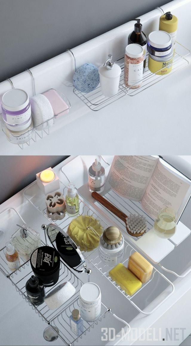 Современный и функциональный аксессуар для ванной комнаты, полки-решетки с декоративным наполнением. В сцене присутствует пять полок с декором (косметика, шампунь, соль, мыло, мочалка, щетка, книга, вино, свечи и пр.)