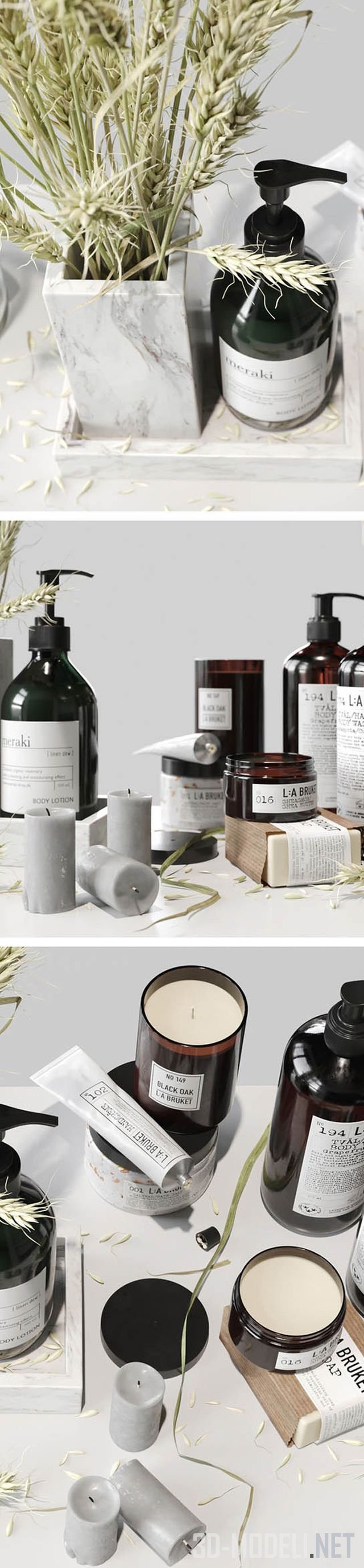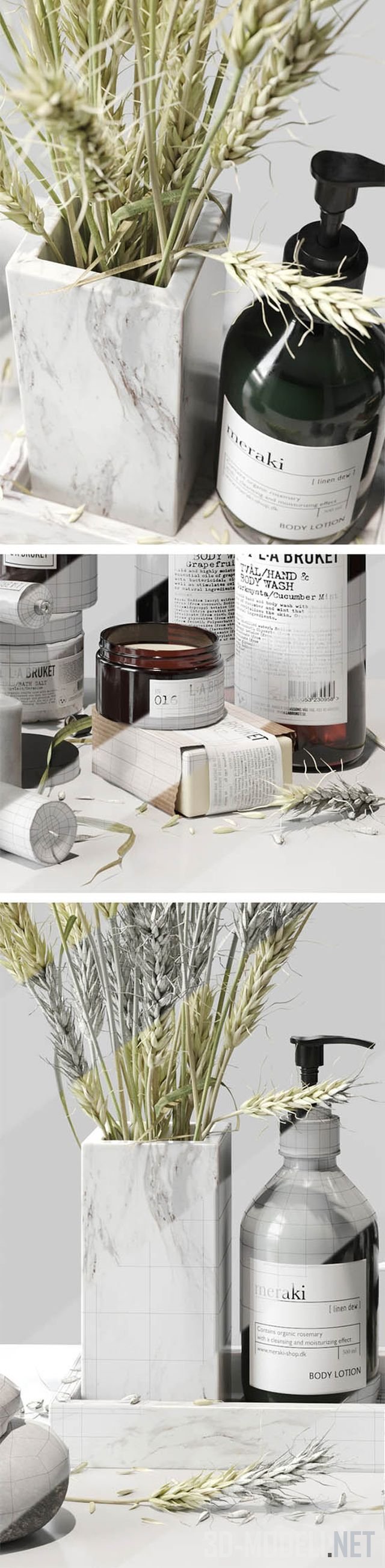 Высококачественная 3d модель набора аксессуаров для ванной комнаты. Хорошо подойдет для этнического интерьера, поскольку содержит пшеничные колоски в мраморной вазе. В наболре есть все, что нужно: крем, мыло, другие средства для ухода, свечи и пр.