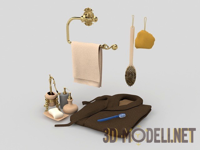 3d модель золоченых аксессуаров, необходимых в любой ванной комнате. В набор входит полотенцедержатель, с мягким бежевым полотенцем, щетка для тела и мочалка, халат, зубная щетка, мыло и пр. Текстура дерева находится в архиве.