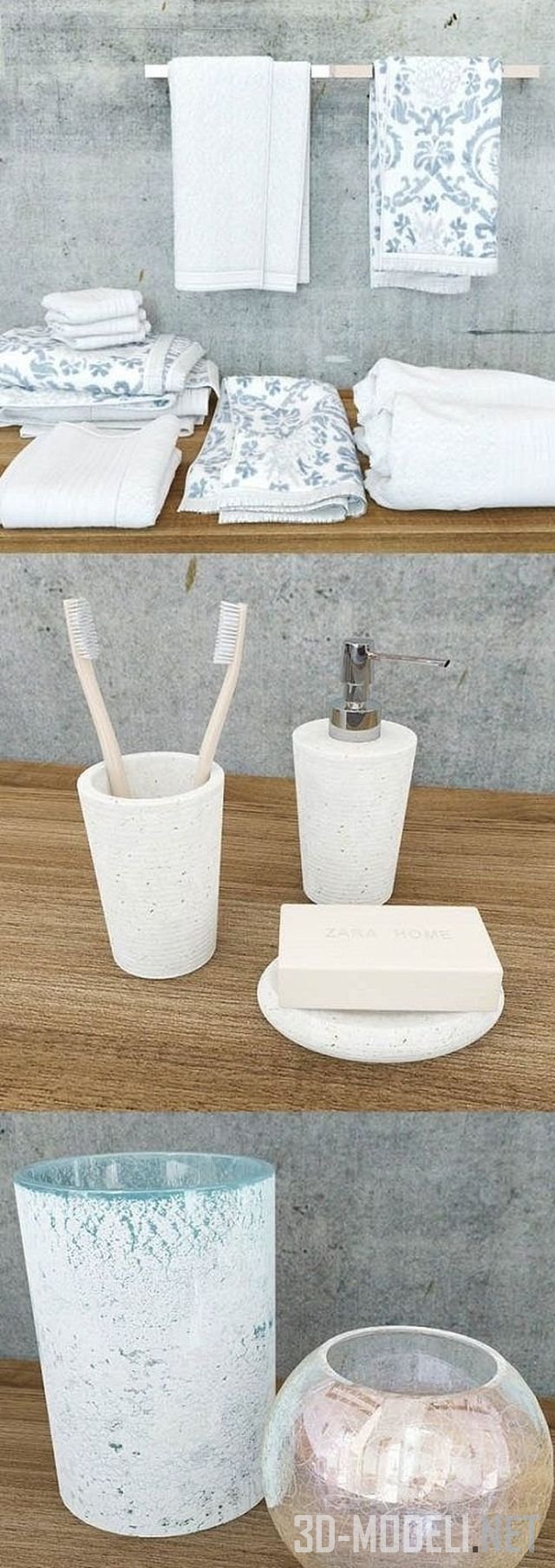 Набор различных предметов и аксессуаров для наполнения интерьера ванной комнаты, от бренда Zara Home. В комплекте присутствуют такие элементы, как свечи, ароматические палочки, набор полотенец FLORAL VELOUR, COTTON TOWEL WITH BORDER, BLUE GLASS VASE, PEARLY FINISH GLASS VASE,