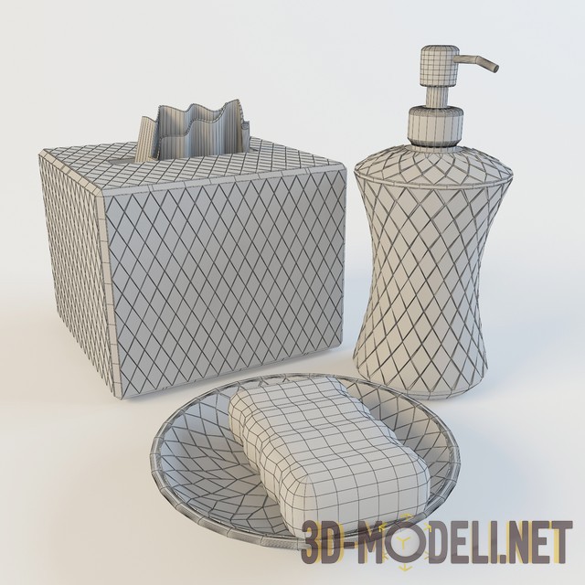3d модель декоративного набора в ванную комнату. Набор с ярким дизайном, в который входит мыльница, коробка с салфетками и дозатор.