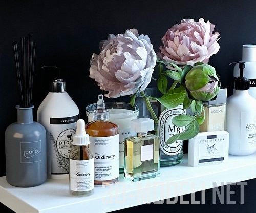 Модель аксессуаров, декора и косметики для наполнения интерьера ванной комнаты. В комплекте множество флаконов и элементов, букет пионов вносит нежность и декоративность. Все текстуры присутствуют.
